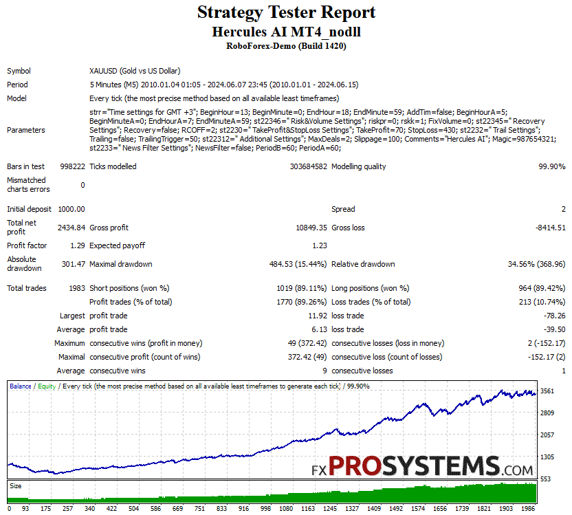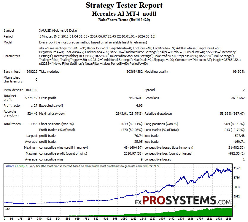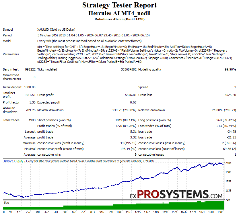 Testing was performed using TDS2 from 2010 to 2024 and default settings. Looking ahead, I would like to note that the Expert Advisor is sensitive to high spreads and therefore I recommend using trading accounts with low spreads, in particular ECN with Zero Spread.